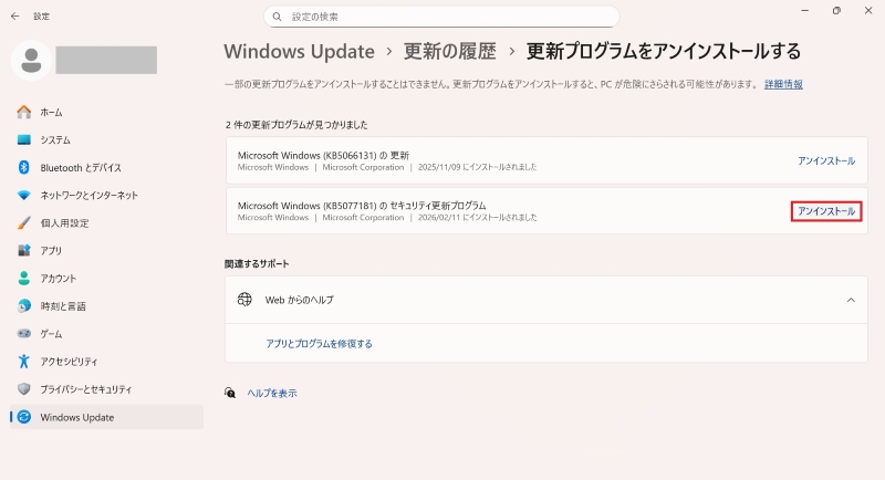※表示されない場合は、KB5074109の後にインストールした更新もアンインストールが必要