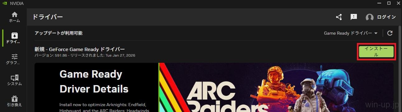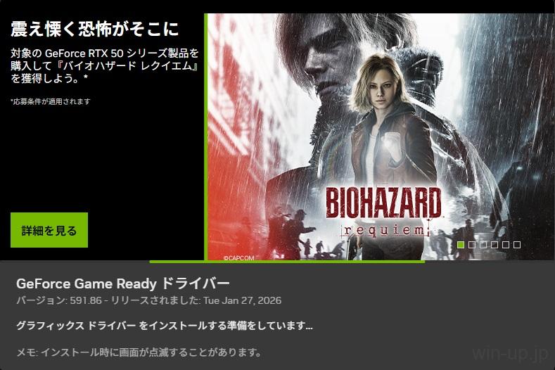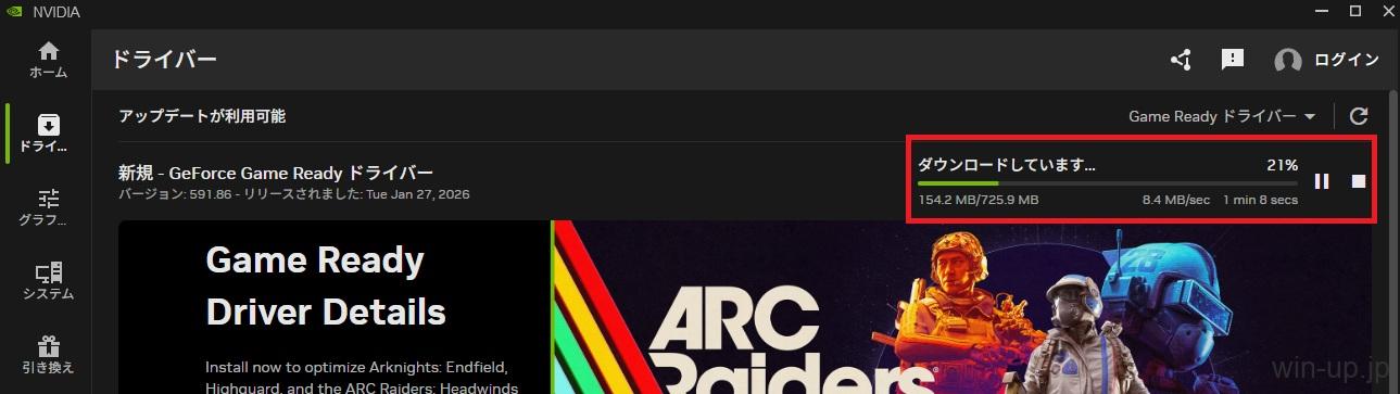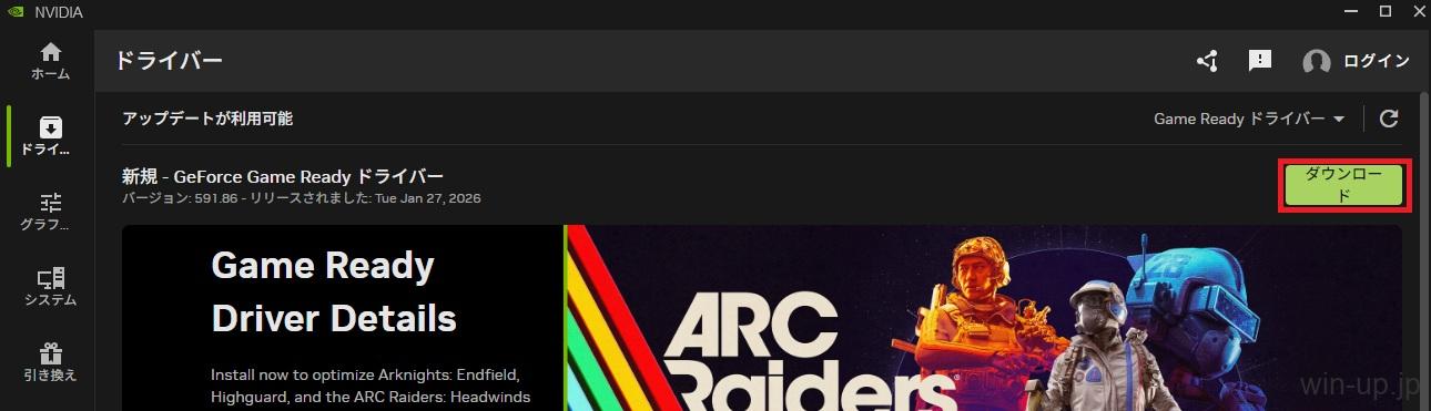 - 右上の「更新プログラムの確認」をクリックします。新しいドライバーがある場合、緑色の大きな「ダウンロード」ボタンが表示されるのでクリックします。