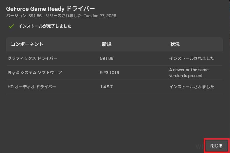 - 下記の画面が表示されたらドライバーの更新は完了です。「閉じる」をクリックして画面を閉じます。